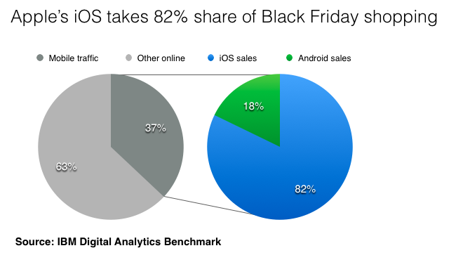 37% of online sales are done on mobile devices. iPhones and iPads account for almost all of those devices. That was certainly the case on Black Friday. I am for anything that takes more Black Friday sales online and off the streets. We are constantly told that there are more Android phones and tablets than iPhones and iPads, so why are mobile purchases so skewed in favor of iOS?